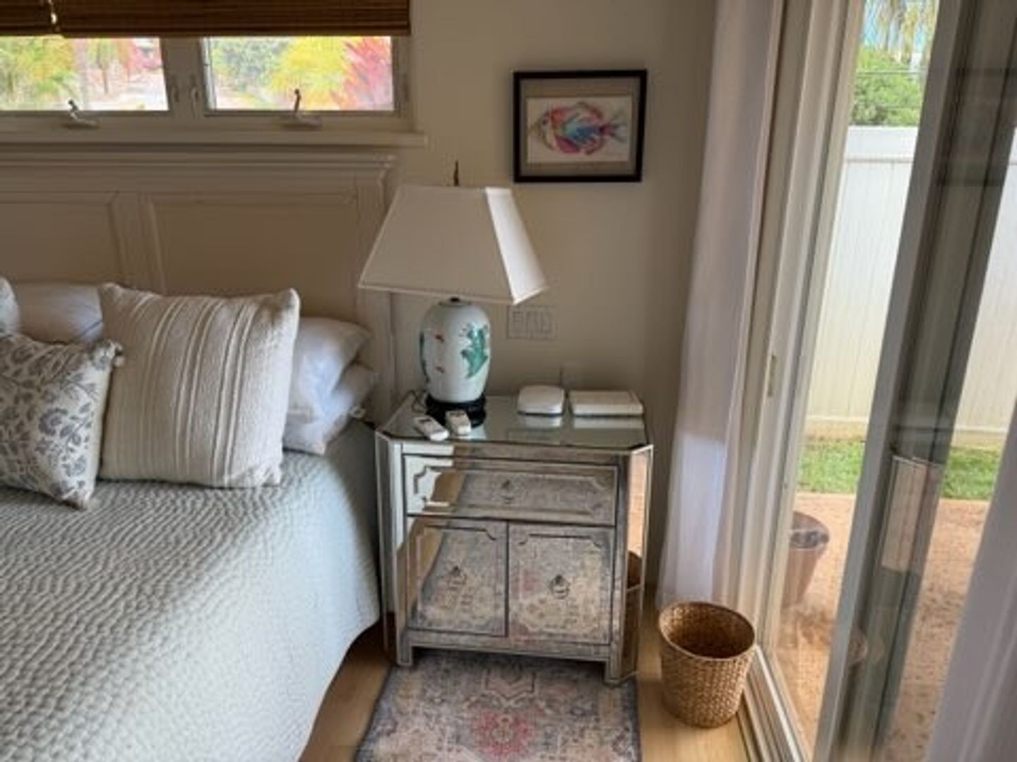 The cottage features all-new appliances, custom cabinetry, quartz countertops, LifeProof flooring, tile finishes, and energy-efficient lighting. Three split A/C units provide year-round comfort, while accordion glass doors open to the covered lanai, creating a seamless connection to the outdoors.