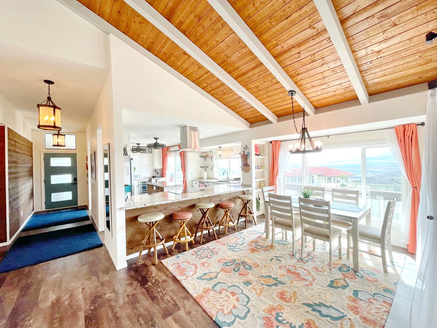 This adequately furnished and well maintained 3 bedroom 2 bathroom upstairs unit is available for the summer months as a seasonal rental. Enjoy captivating bi-coastal views of the Northshore and South shore from many areas of the home and mountain views of Haleakala as you look over the expansive central valley. Notable features: private access to the pool via French doors from all 3 bedrooms, upgraded bathrooms, upgraded kitchen, granite countertops, white shaker cabinets, stainless steel appliances, new washer and dryer, separate beverage fridge and wine fridge, tropical landscaping, pool with 2 cabanas, and 3 fireplaces- located in the main living room, the master bedroom and in the backyard pool cabana. The backyard pool area is amazing for relaxing or entertaining encompassed by a tropical and peaceful terraced garden with an array of fruit trees.