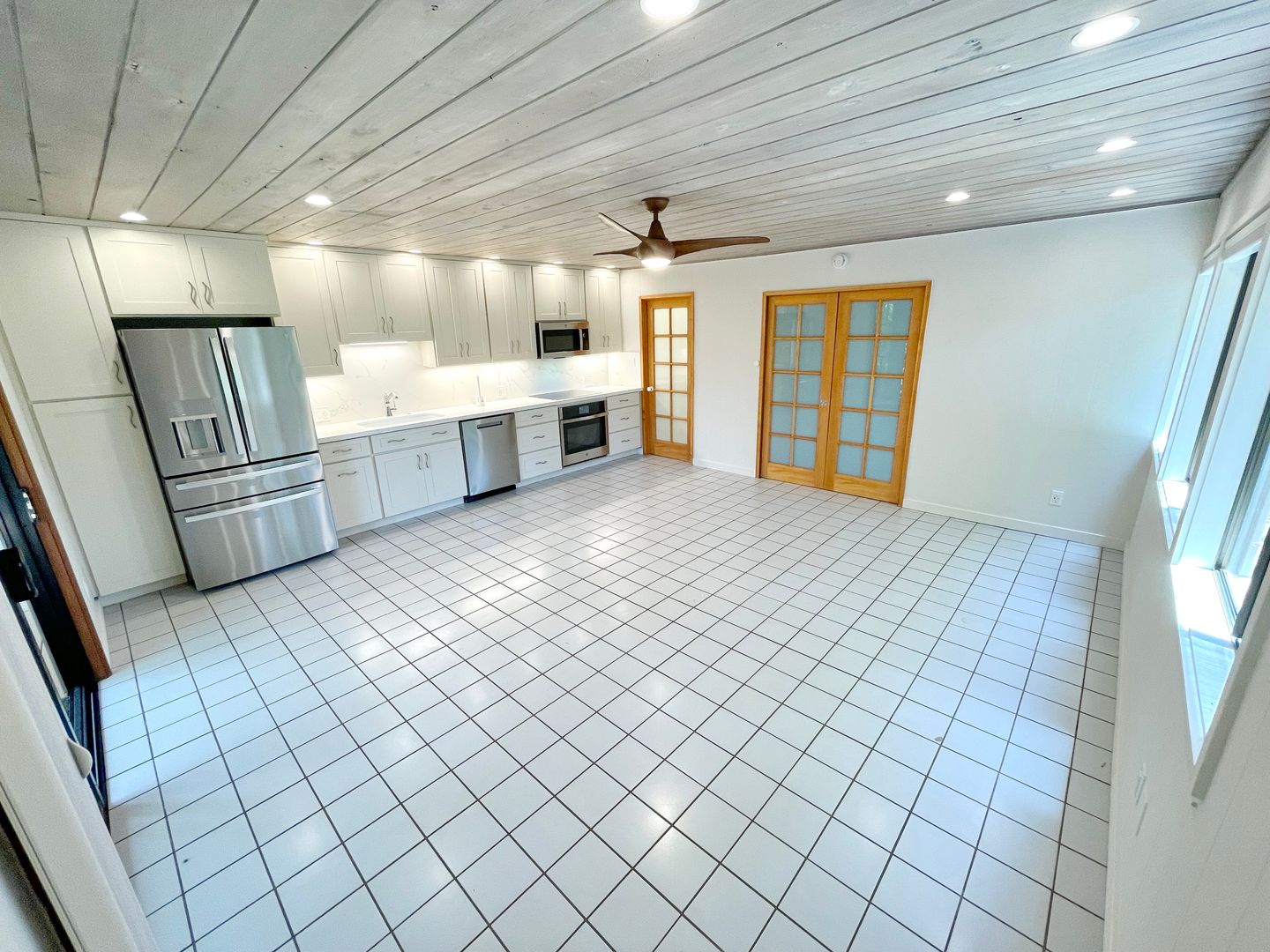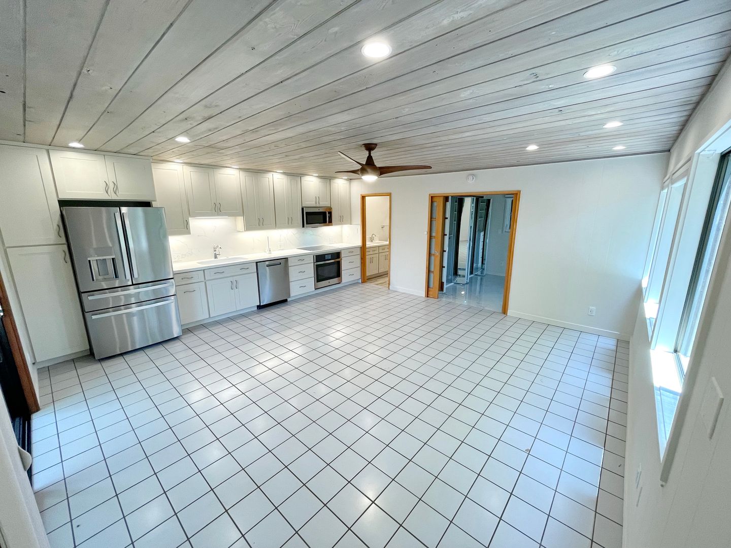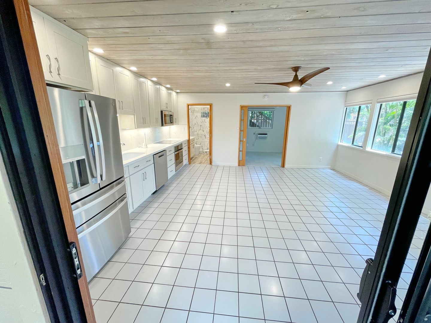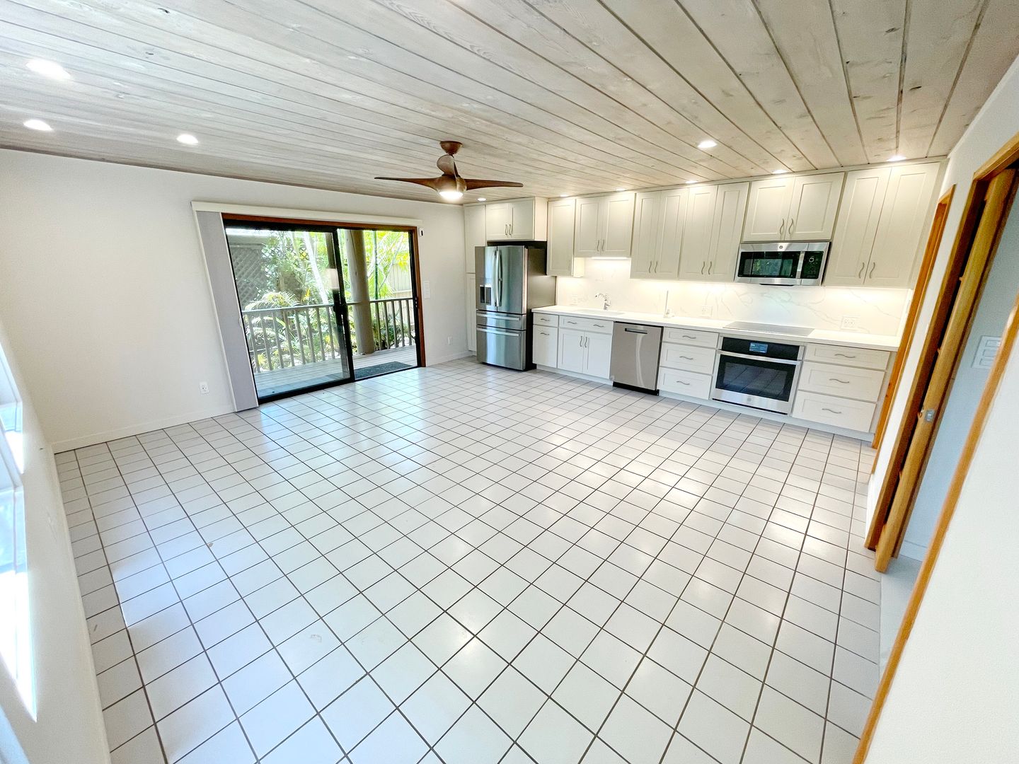 . Open-concept living and kitchen area with stylish tile flooring