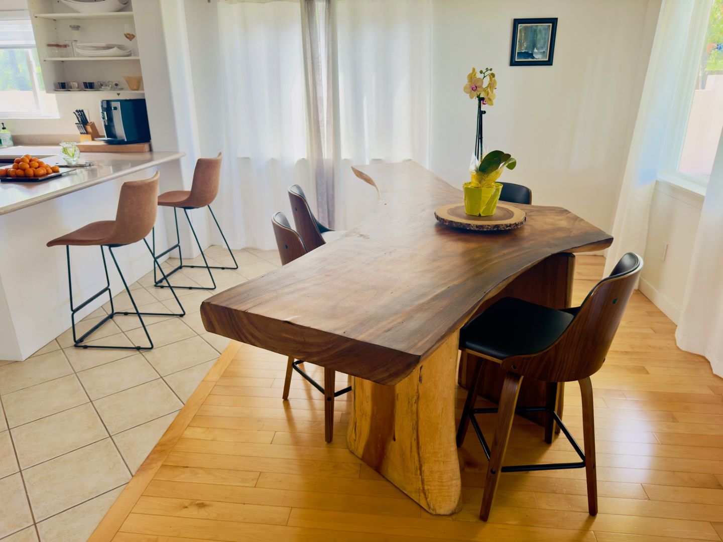 The grand living area includes a large leather sectional. The dining space centers on a striking Monkeypod wood table seating eight, ideal for entertaining.