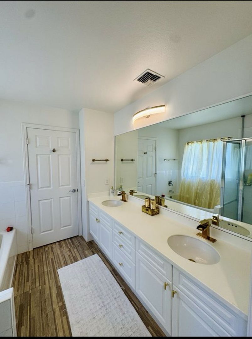 4 bedrooms and 3 full bathrooms (or 4 bedrooms plus a home office) span two levels for privacy. The master suite features vaulted ceilings, a private lanai, walk-in closet, and spa-like en-suite bath with soaking tub and walk-in shower. A downstairs bedroom is perfect for guests or a home office.