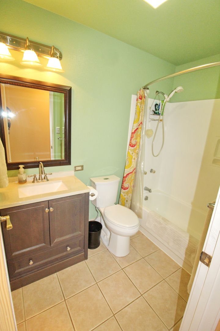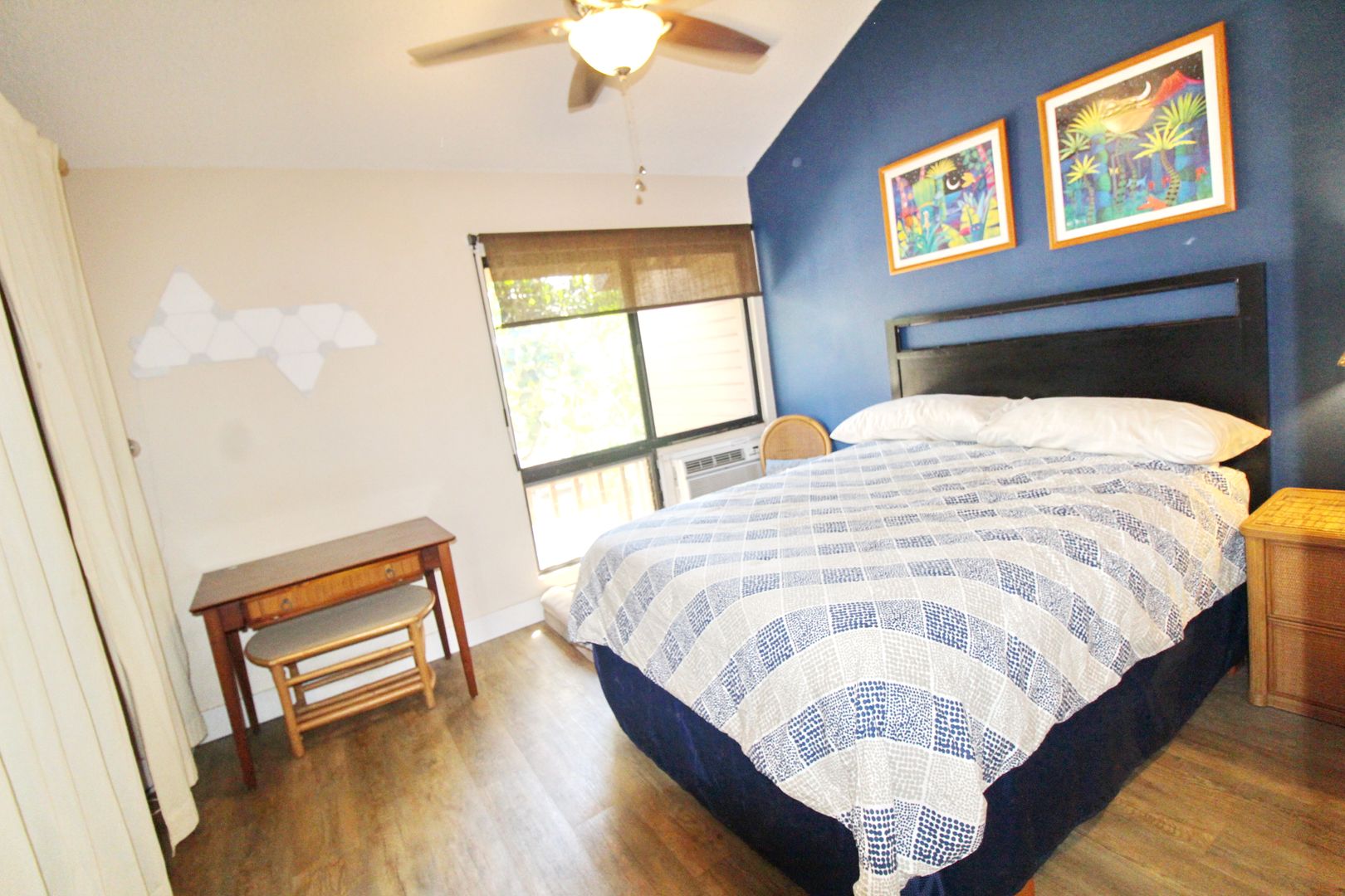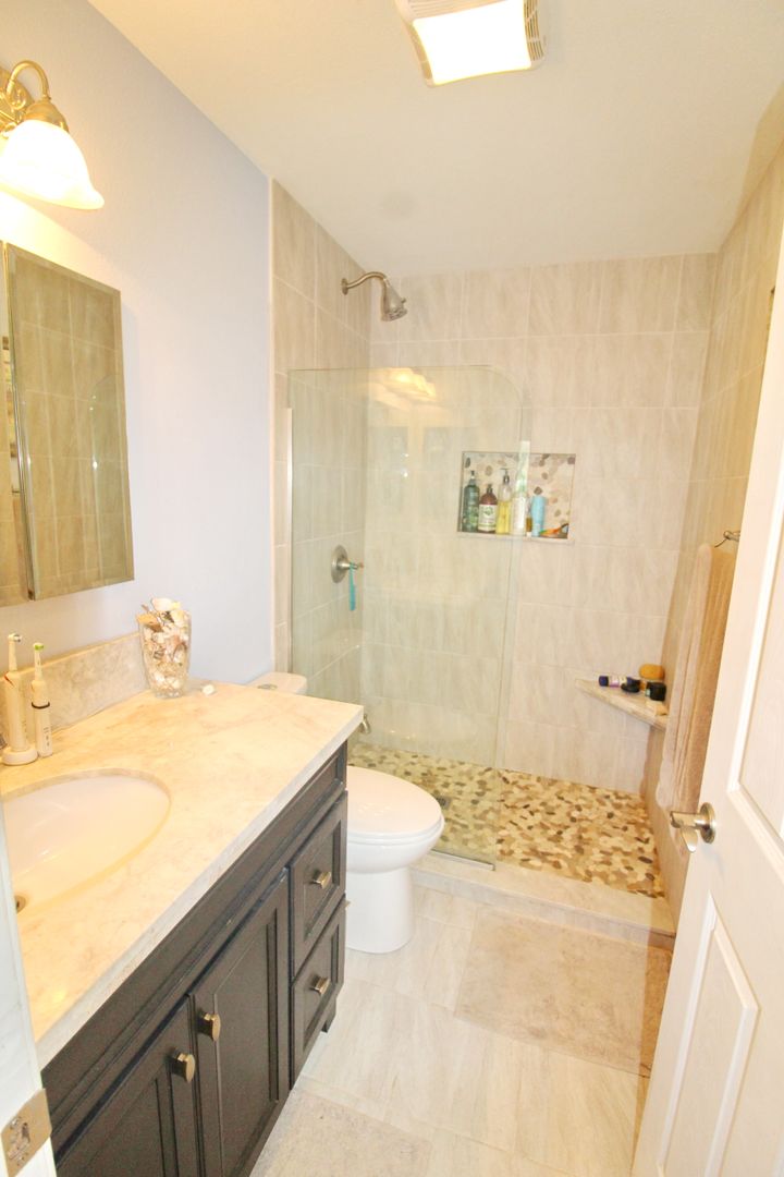 Stay comfortable year-round with three A/C units and four ceiling fans. For added convenience, the unit includes an in-home washer and dryer. The primary suite features a beautifully designed walk-in shower with tile, stone, and glass finishes, along with updated vanities in both bathrooms.