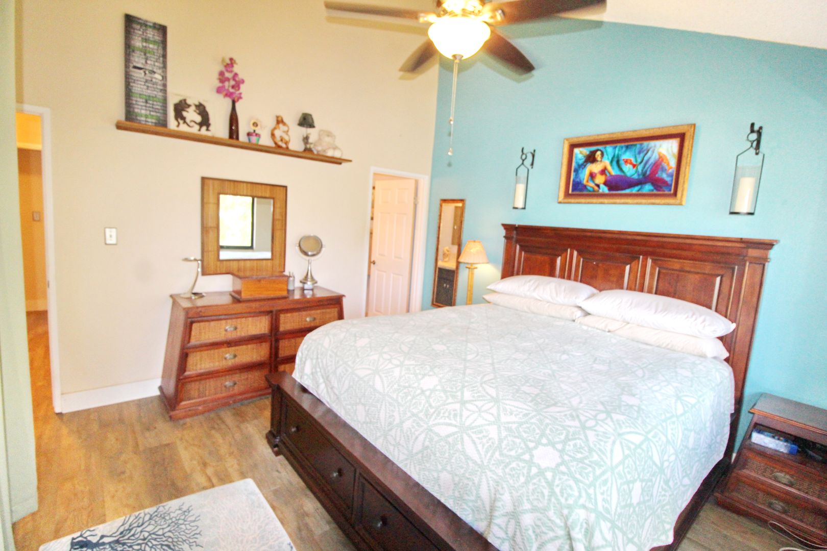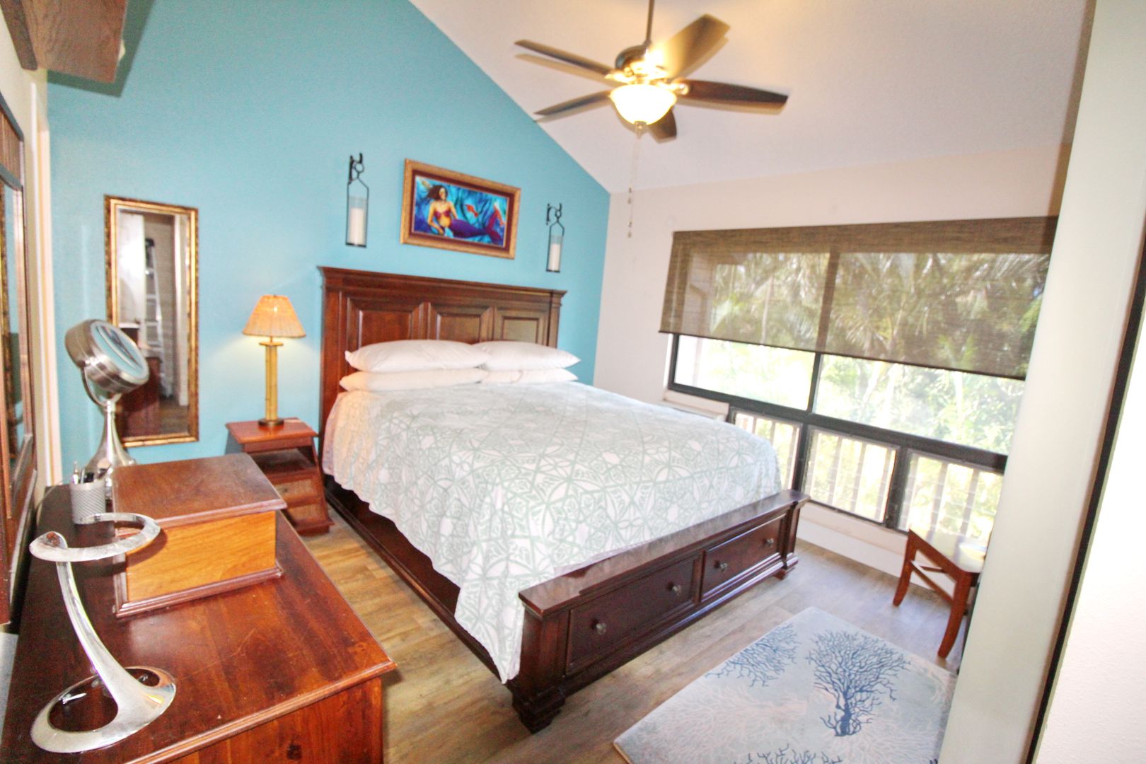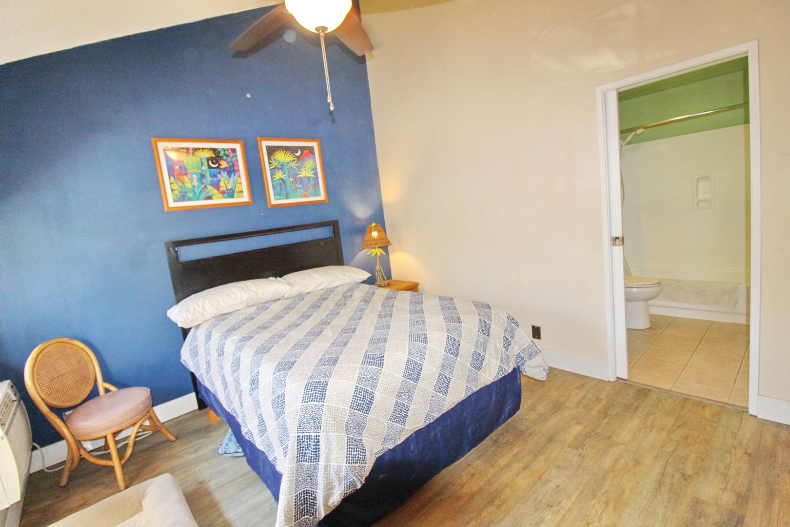 Stay comfortable year-round with three A/C units and four ceiling fans. For added convenience, the unit includes an in-home washer and dryer. The primary suite features a beautifully designed walk-in shower with tile, stone, and glass finishes, along with updated vanities in both bathrooms.