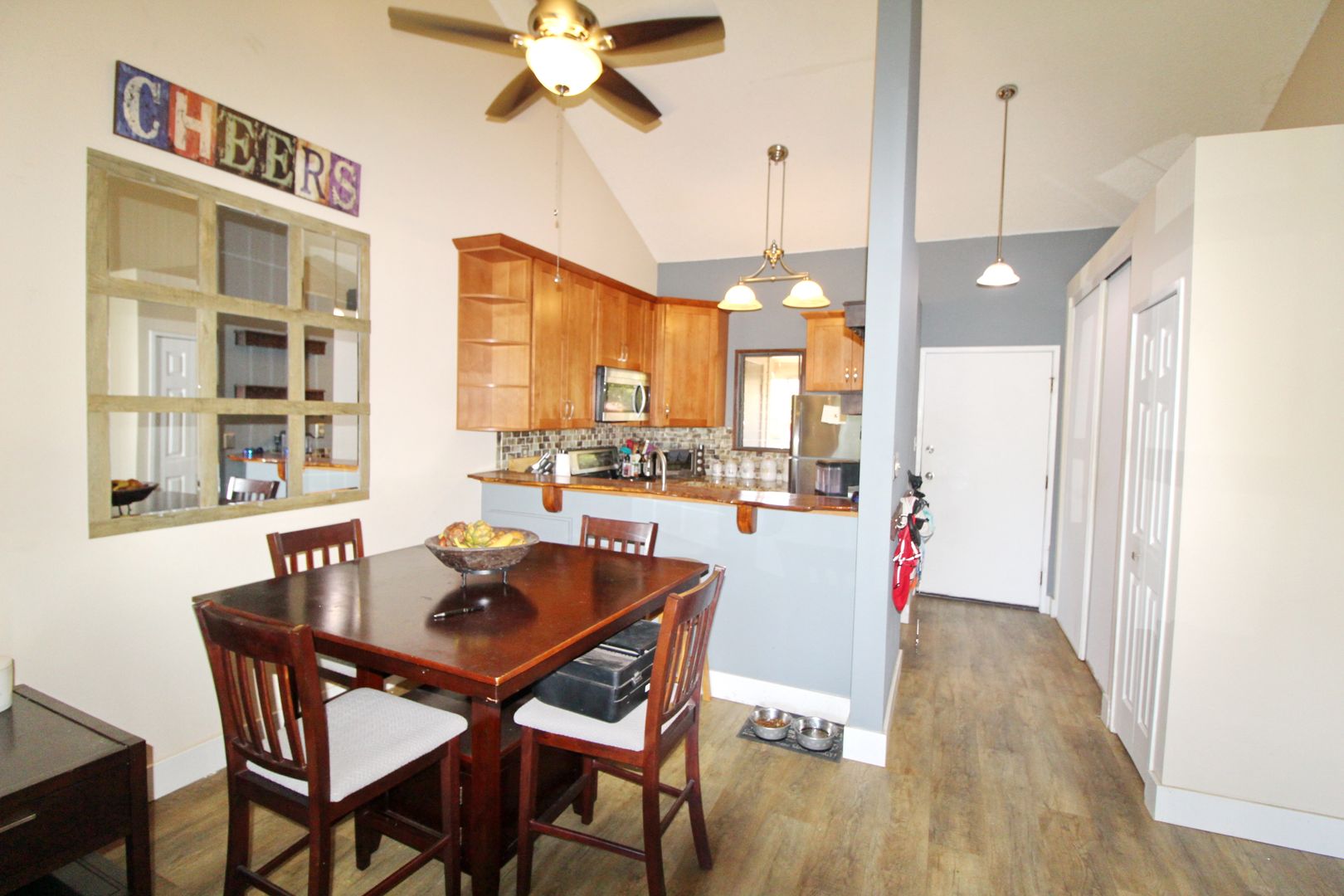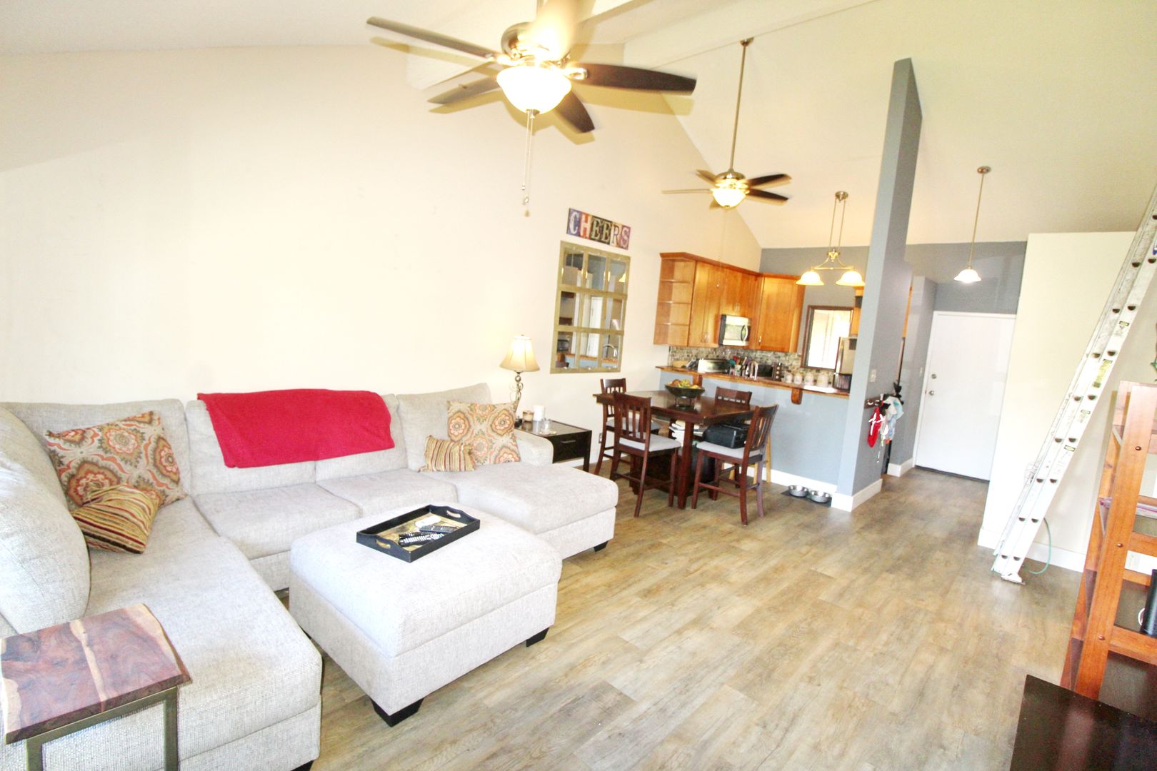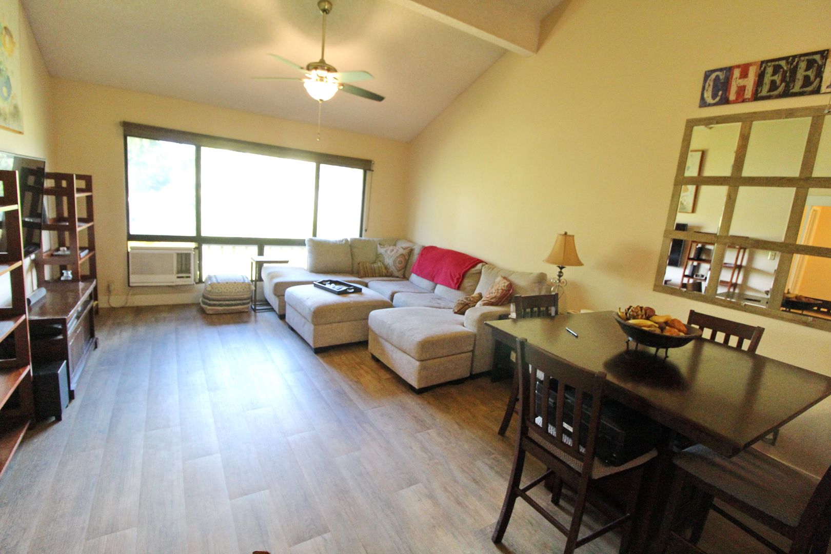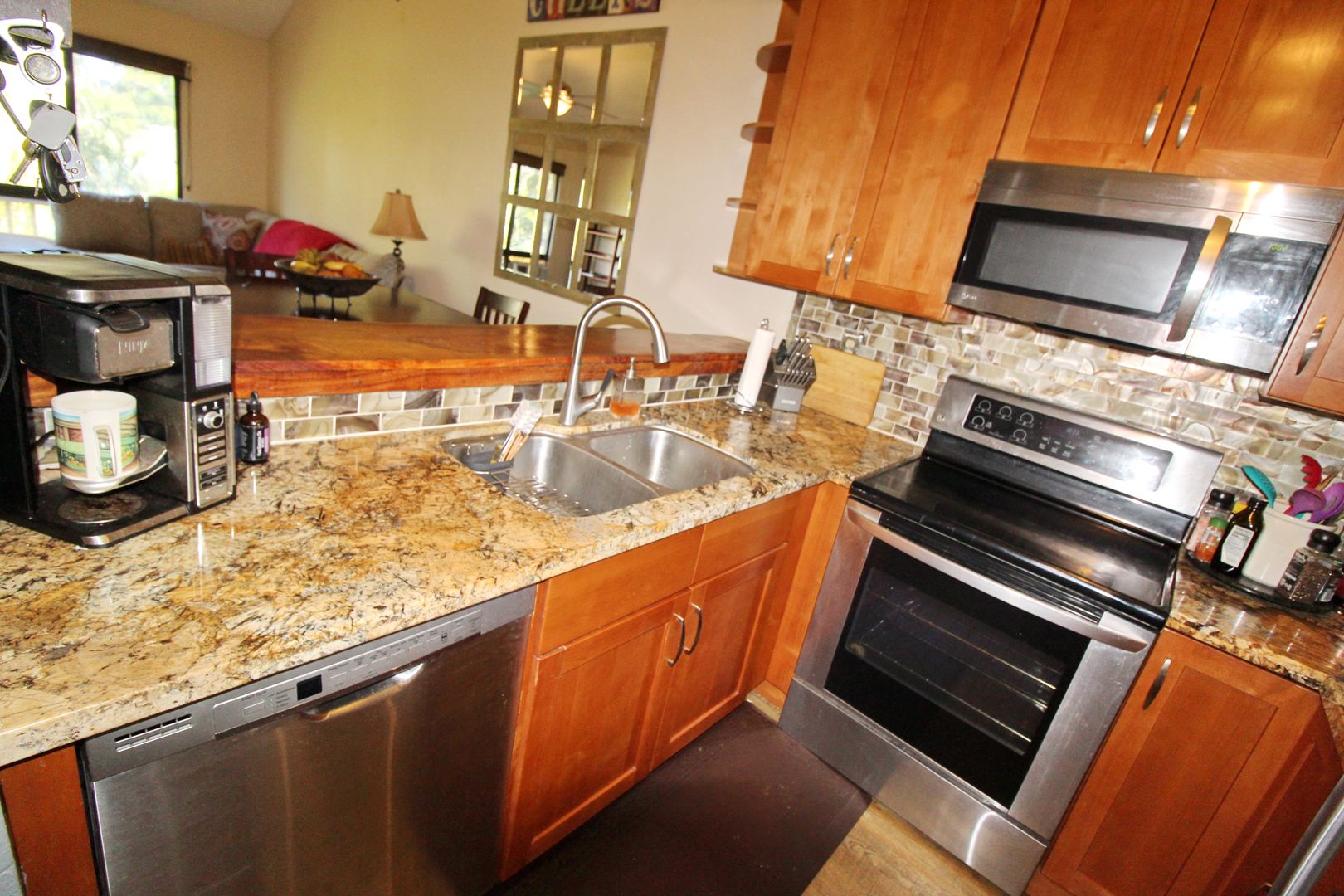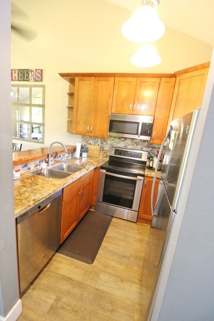 The upgraded kitchen is equipped with granite countertops, a polished wood bar top, stainless steel appliances, and stylish pendant lighting—perfect for both everyday living and entertaining. The open layout flows into a spacious living area with oversized windows and wood-grain luxury vinyl flooring.