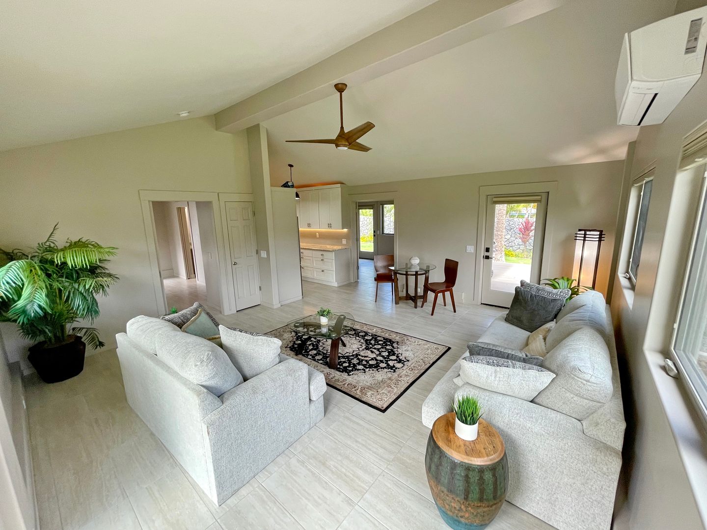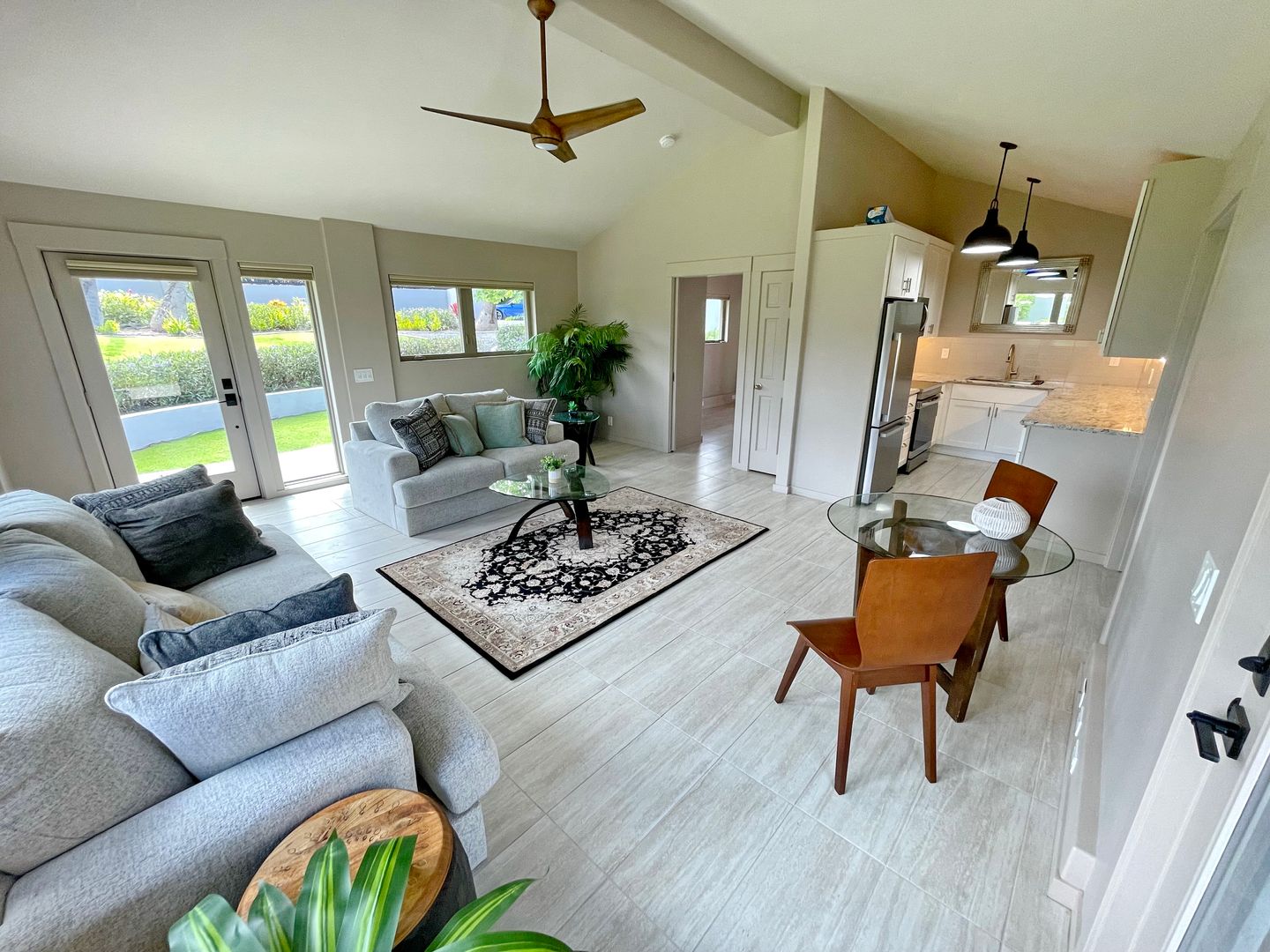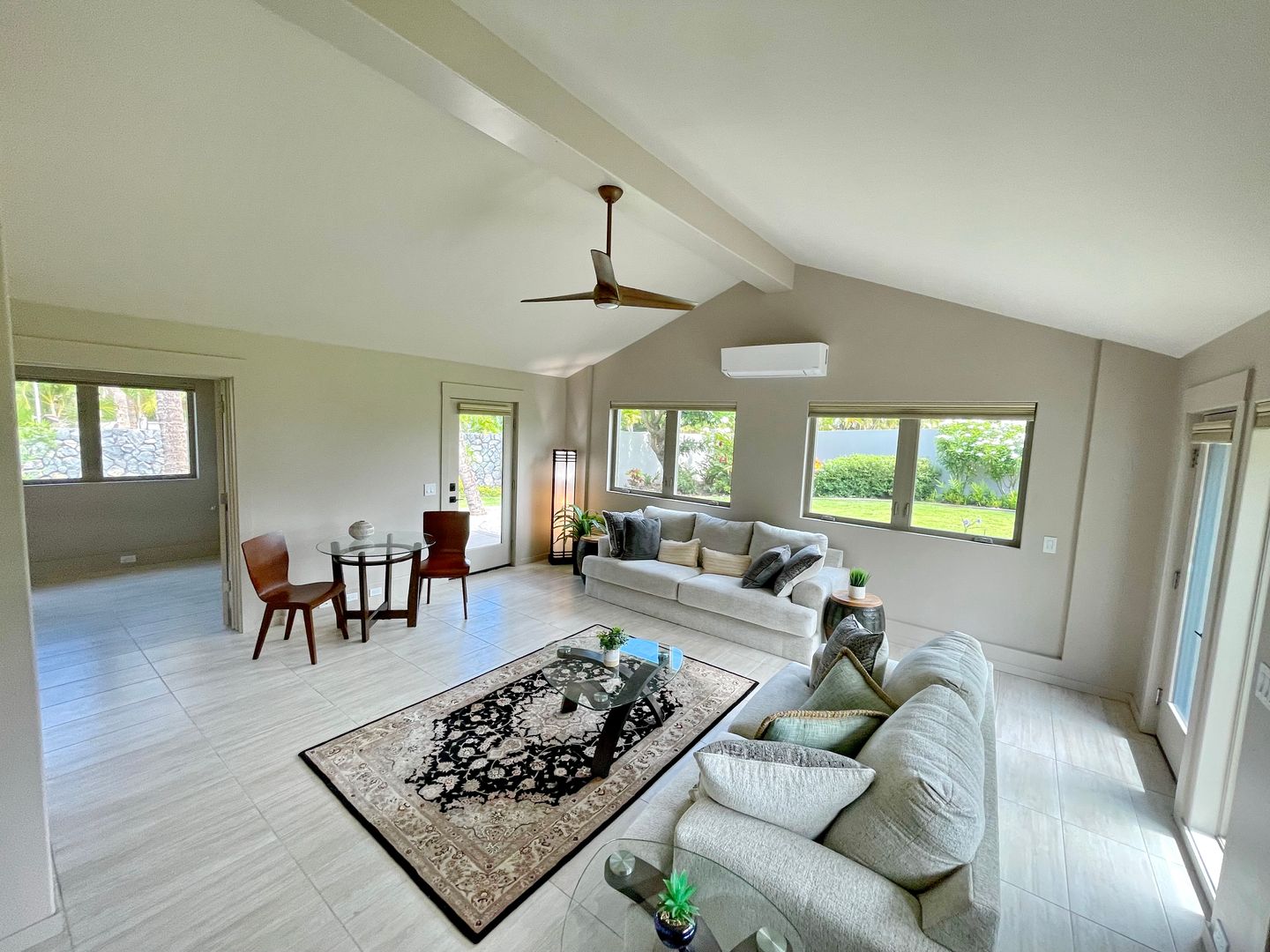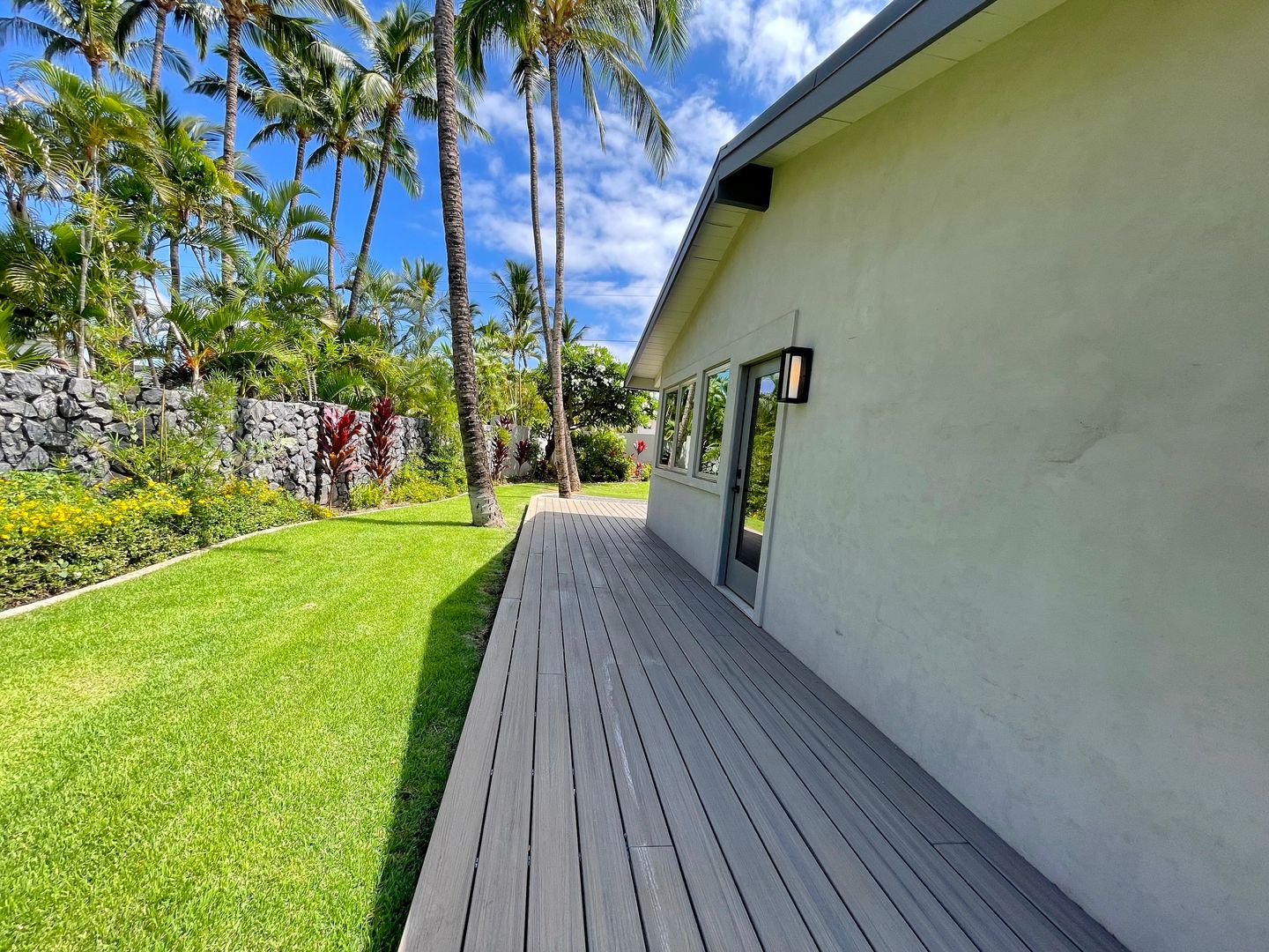 Step inside to cool tile flooring, granite countertops, and an open, breezy floor plan with vaulted ceilings and Pella windows that invite in the natural light. Enjoy your mornings or evenings on two private lanais—one open-air, one covered—ideal for relaxing with coffee or hosting casual get-togethers. There is so much room to spread out and relax in privacy on the property.
