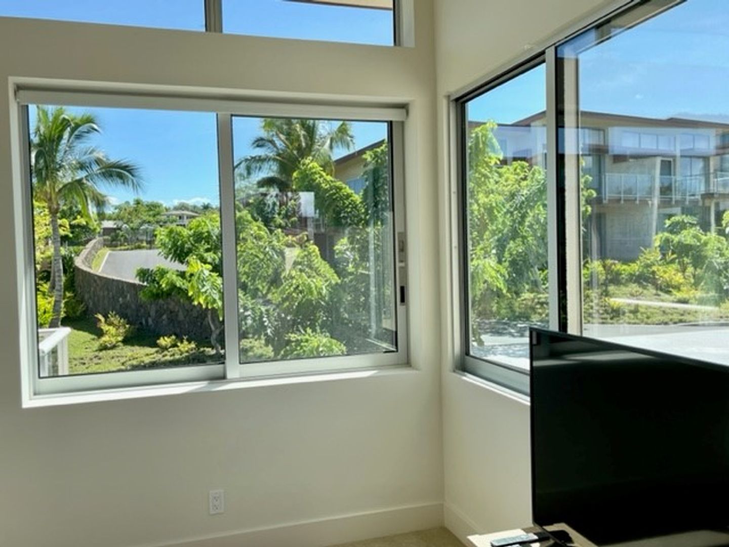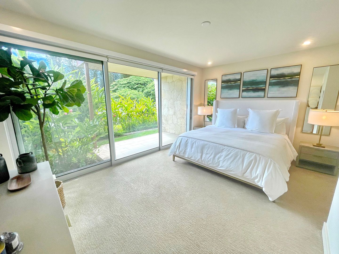 This finely furnished 3-bedroom, 3-bathroom mid-century modern tri-level home is a stunning fusion of contemporary design and Hawaiian cultural elements. Expansive floor-to-ceiling glass walls bring in natural light and frame picturesque views of the ocean and surrounding lush greenery—especially from the great room and the master suite, which boasts a breathtaking ocean panorama. This floor plan has the most desired floorplan including a "casita" which is the third bedroom located on the third level with a separate entrance and an ensuite bathroom making it the perfect place for guests or family to relax in privacy.