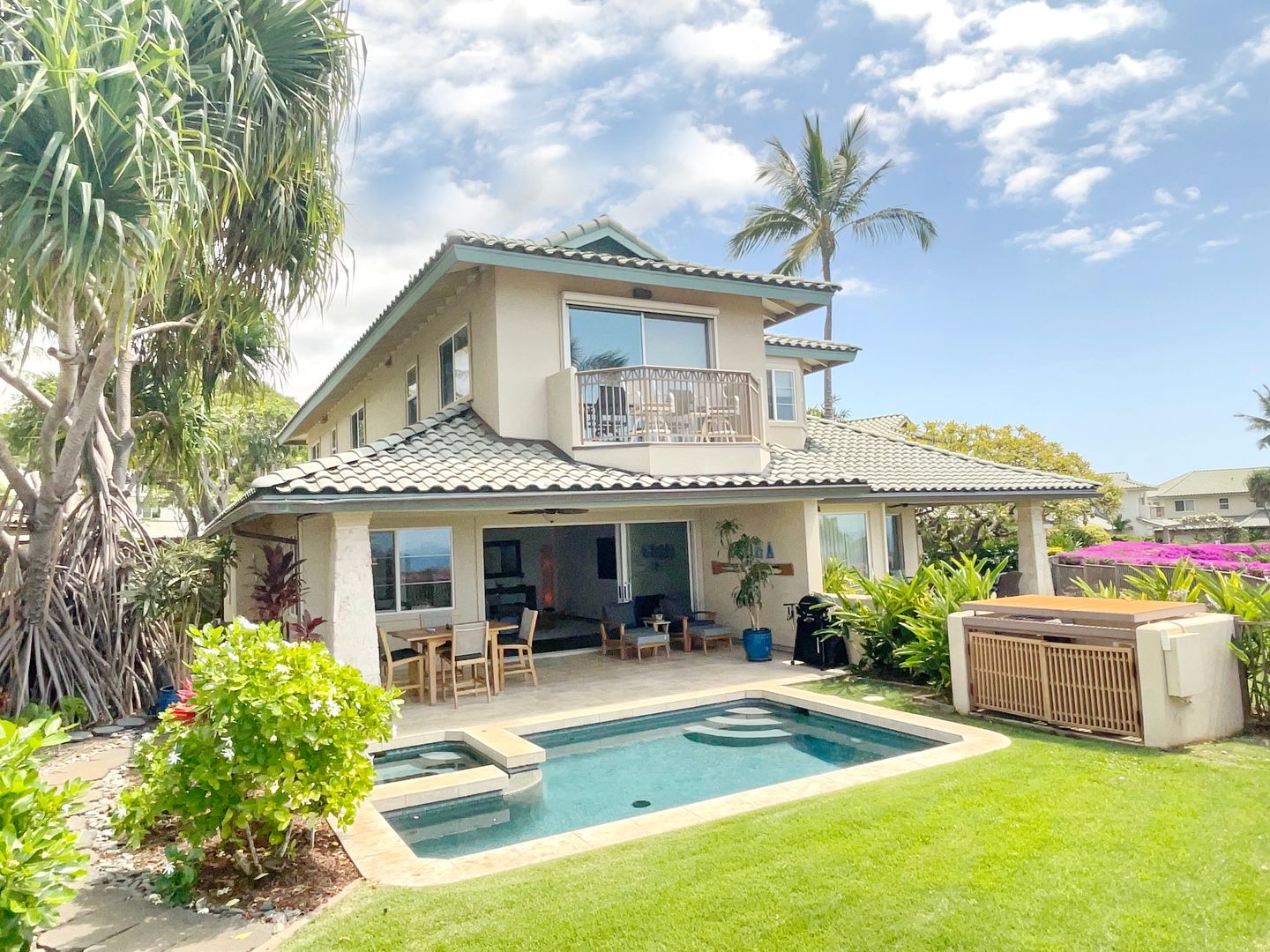 Peaceful and finely furnished luxury 3 bedroom, 2.5 bath townhome. The townhome boasts amazing ocean views throughout the first floor, and from the master bedroom, both levels enjoy private lanais. Central air conditioning and ceiling fans throughout will keep you cool and comfortable no matter the outside conditions. The garage has covered parking for one car, plus private driveway has additional parking spaces. Furnished Lanai & backyard boasts approx.750 sq.ft. set-in a tropical splendor and serenity of a private backyard with lush gardens & ocean views, your own private heated saline pool/spa, BBQ & ceiling fan.